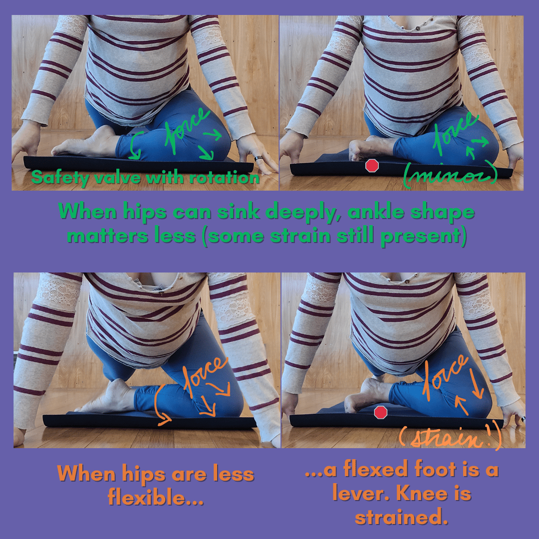 If the knee is aiming for 90º in Pigeon, we want to allow for the knees’ natural rotation as a safety valve for tight hips. Flexing at the ankle transforms the foot into a lever with a hard stop: your knee cannot rotate because your foot can’t push through the floor. While it’s nice to believe that stopping knee rotation will target the hips, in reality, if the hip muscles have reached their limit, the weight of the body will transfer down into the knee. If the foot is stopping rotation, that translates to shearing forces that can damage ligaments as upper leg goes one way, and lower leg has no give.