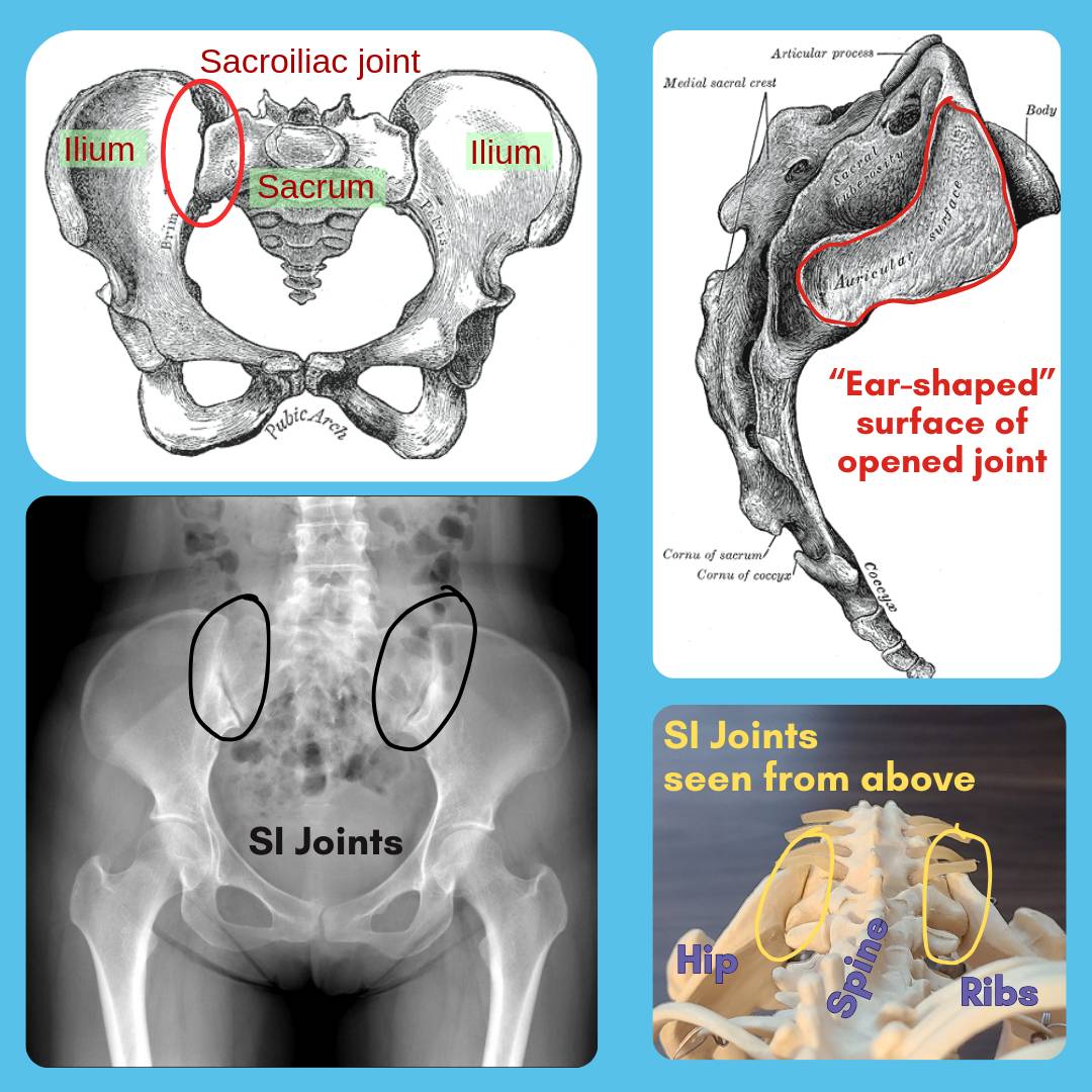 The sacroiliac joints, or SI Joints, mark the transition from your pelvis to your spine. The sacrum acts like the keystone, or uppermost part of an arch, in the transference of weight from the torso, through the arch of your pelvis, down to your leg bones. These joints don’t look like your classic hinge, nor your ball and socket style; they are bumpy, elongated ear-shapes, which move by sliding against each other a very little bit. I believe they are angled to fit front to back, like a jack-o’-lantern top…but it’s hard to be sure, as most renderings are 2D, and I haven’t personally done dissections. (Plus, few sources describe anatomy how I want them to! 🤷♀️ Zoom in on the skeleton image, lower right, to draw your own conclusions.)